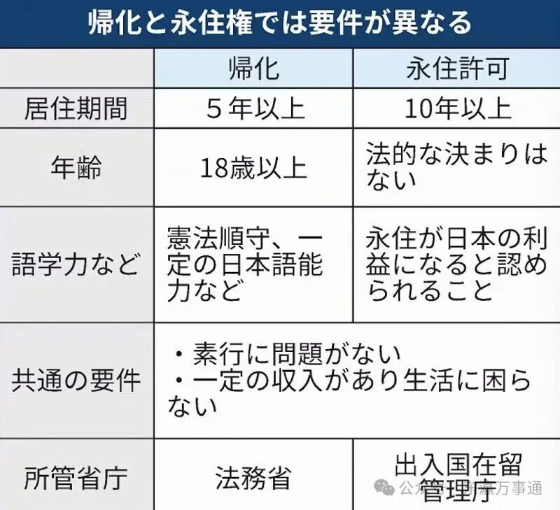 此外,也要求申请人具备不妨碍日常生活的日语会话与读写能力。相较之下,取得永久居住留资格的“永住者”签证反而条件更严格。原则上需在日本居住10年以上,而归化仅需5年,因此有人批评,“现在出现比起取得永住签证,归化反而更容易的逆转现象”