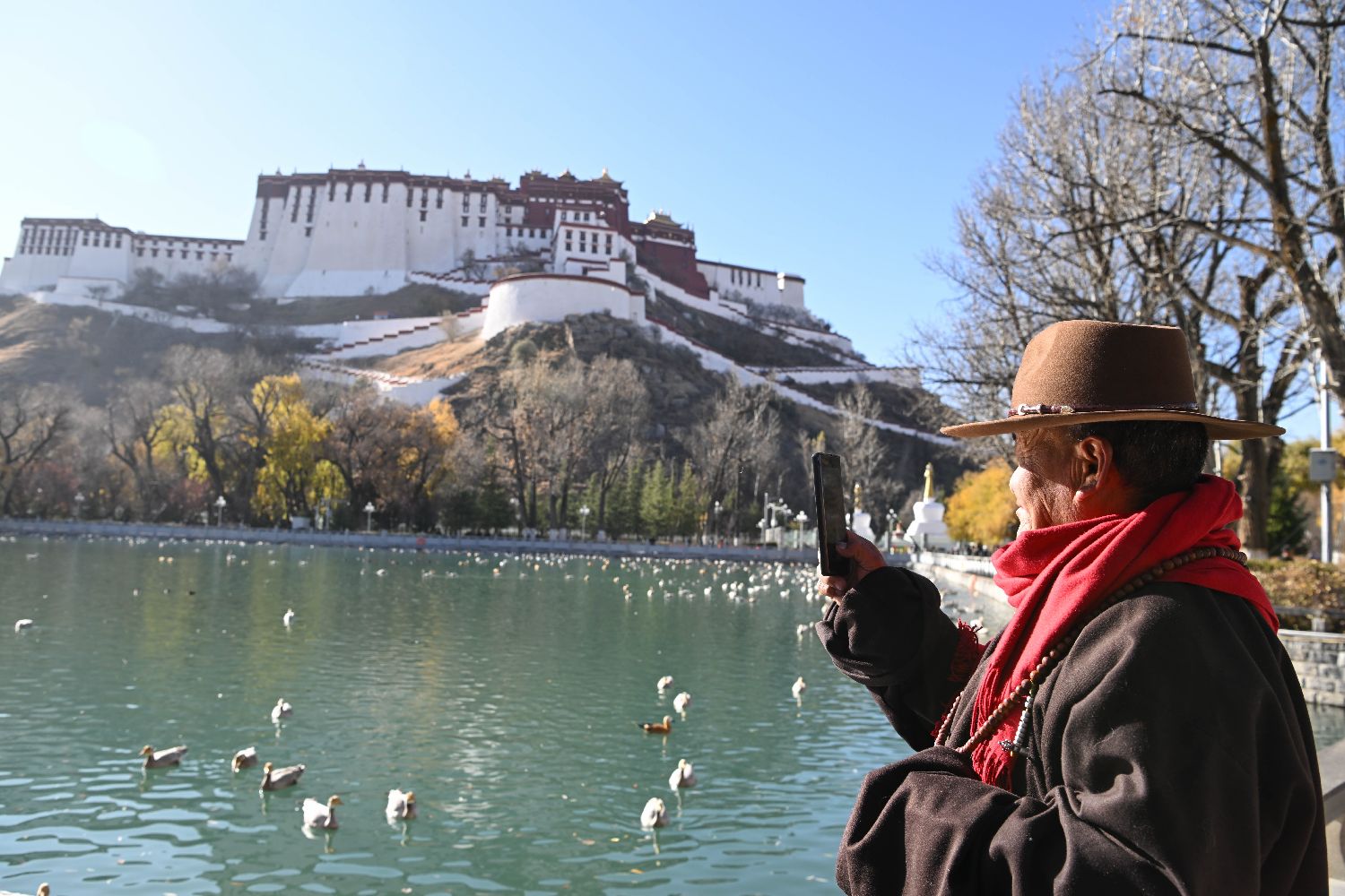 11月22日,西藏拉萨市宗角禄康公园人工湖畔热闹非凡。大批候鸟飞抵这里越冬,成群的赤麻鸭、斑头雁在湖面上嬉戏觅食,吸引了众多市民和游客前来观赏拍照。(图/中新社)