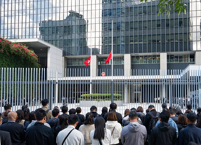 11月29日,香港特区政府总部国旗和区旗下半旗,部分香港民众在特区政府总部前肃立,向火灾罹难者表达哀思。(图/中新社)