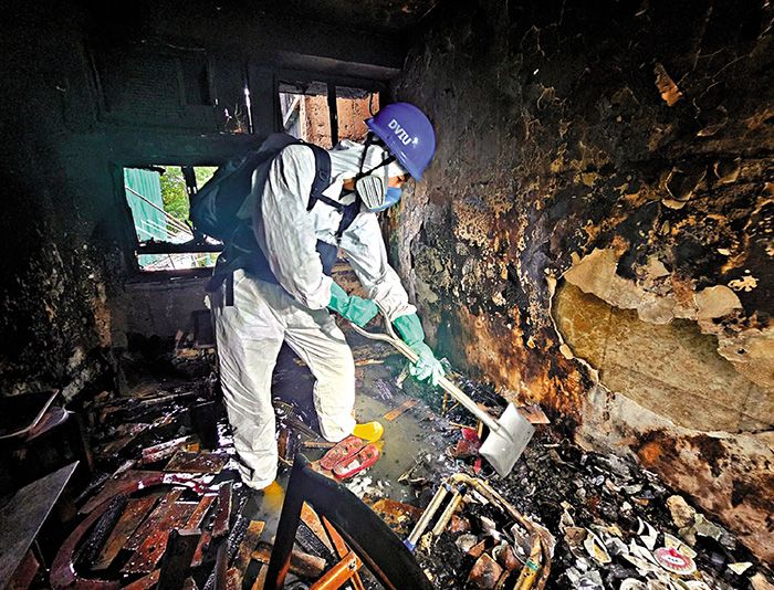 警方灾难遇害者辨认组(DVIU)连日进入灾场搜索。(图/香港《大公报》)