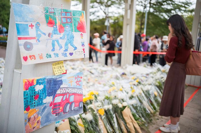 11月30日,大批香港民众自发前往大埔宏福苑火灾现场,在警戒线外排队献花,悼念火灾罹难者。 (图/中新社)