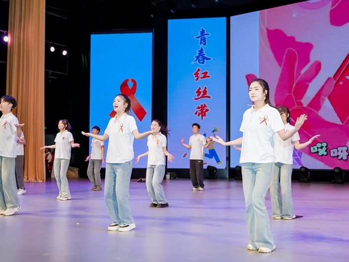 图为11月28日,2025年贵州省青少年“世界艾滋病日”主题宣传示范活动现场志愿者表演。(人民网)