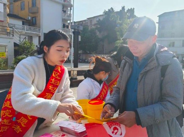 11月28日,由福建省宁德市卫健委、市总工会主办,市疾控中心、市妇幼保健院等多部门联合承办的第38个“世界艾滋病日”主题宣传活动举办,图为工作人员给群众讲解宣传册内容。(福州东南网)