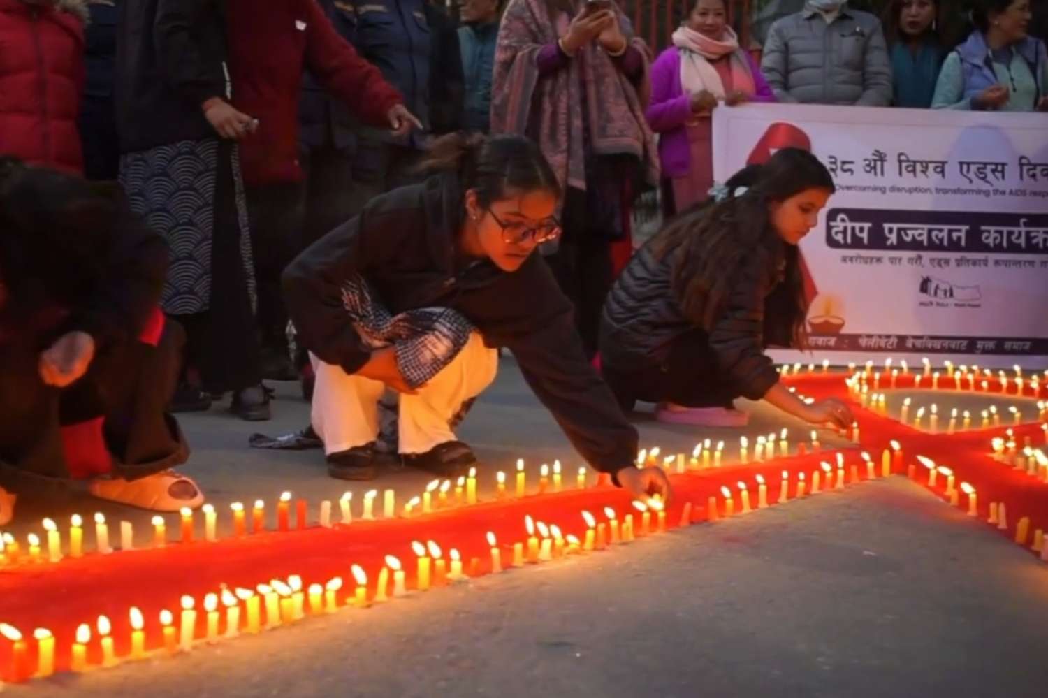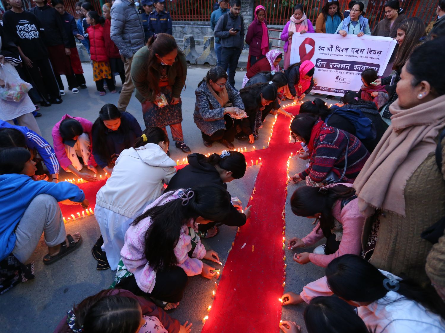 图为11月30日,尼泊尔加德满都,尼泊尔活动人士在世界艾滋病日前夕举行烛光守夜活动。主办方表示,此举旨在提升尼泊尔社会对感染人类免疫缺陷病毒(HIV)人群的关注与理解,为消除歧视、加强关怀发声。(CFP)
