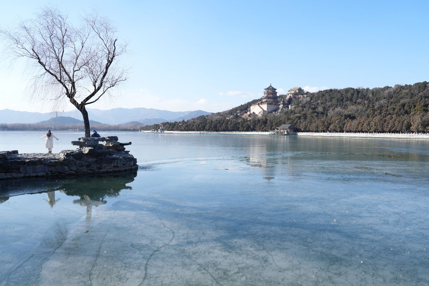 2025年1月5日,北京颐和园昆明湖部分水域仅结一层薄冰。(图/中新社)