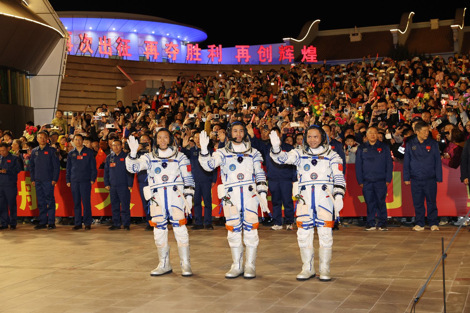北京时间10月31日20时48分,神舟二十一号载人飞行任务航天员乘组出征仪式在酒泉卫星发射中心问天阁圆梦园广场举行。图为张陆、武飞、张洪章。(图/中新社)