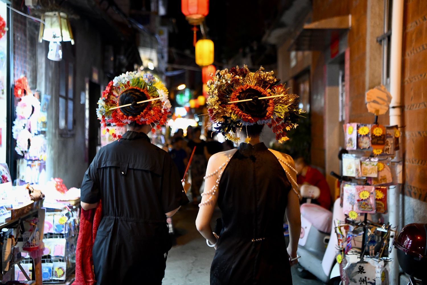 当地时间7月23日晚,福建泉州,游客簪花围游览西街。西街是泉州最早开发的街道和区域,自唐朝成街已超过1300年。这里有传统的闽南红砖古厝,也有近现代的骑楼和番仔楼,这里还保留了地道的泉州风味美食,吸引众多游客前来品尝。(图/中新社)