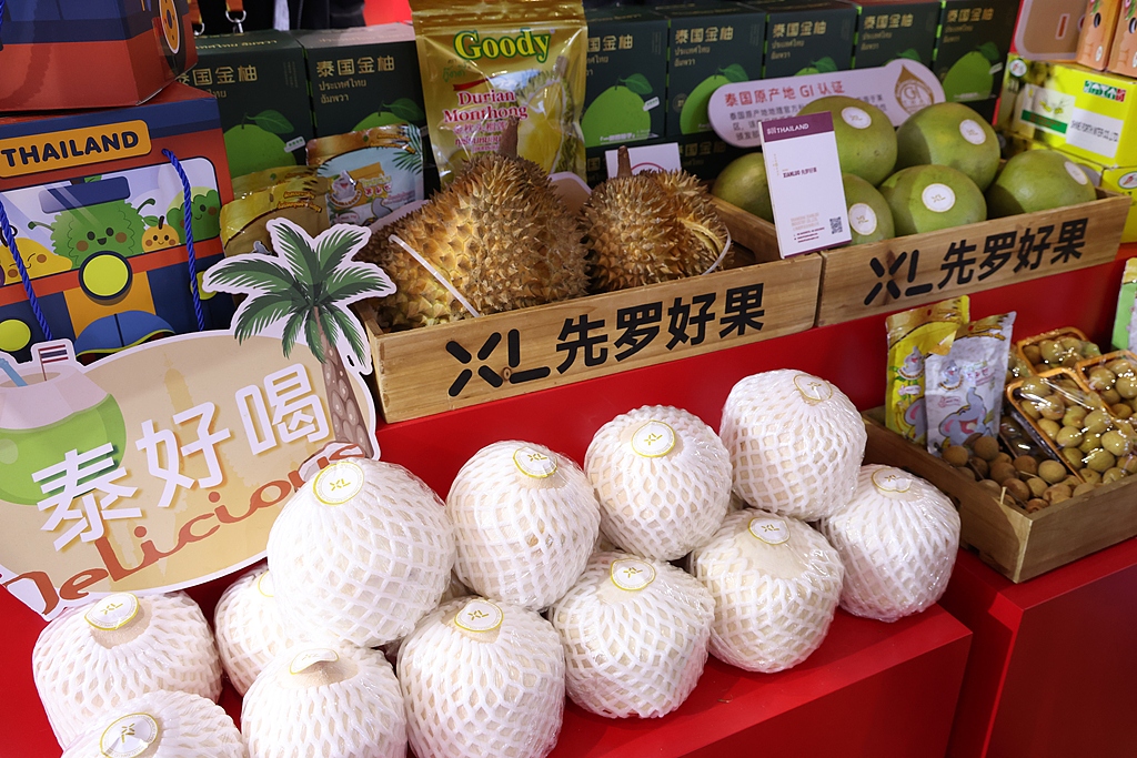 11月,在上海举办的第八届中国国际进口博览会上,泰国农食产品企业馆展出椰子、榴梿等多款水果。(视觉中国)