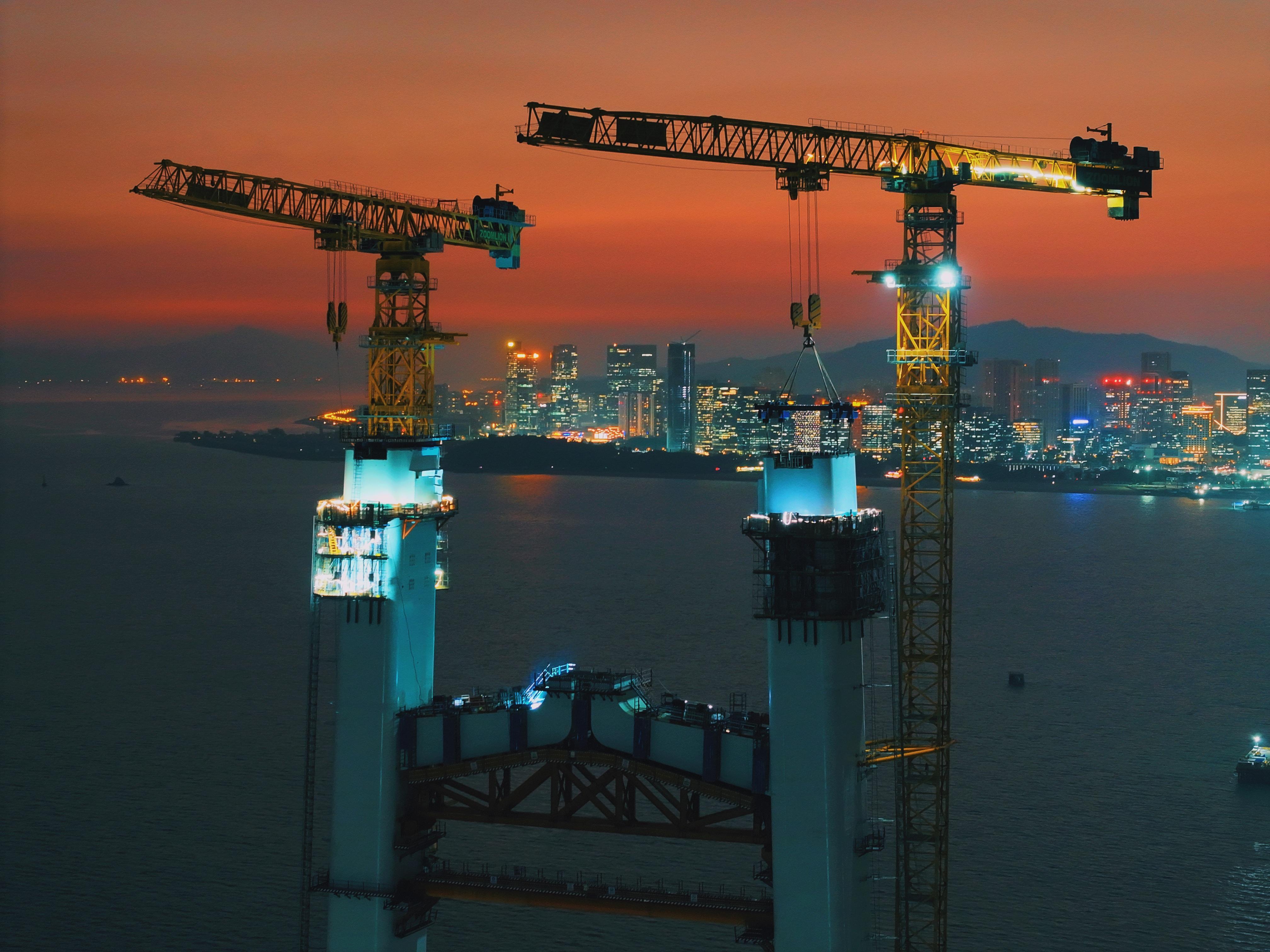 厦金大桥关键控制性工程刘五店航道桥主塔为预制装配化大型海中桥塔,创新采用无筋钢壳混凝土组合结构桥塔设计方案。考虑施工海域风大浪急、多工序交叉等复杂因素,项目团队创新采用“绕墩方案”,在每节段塔柱外侧设置定型钢平台,配合大型起重机实现全工况吊装定位、钢壳节段焊接和混凝土浇筑,在冬季季风期仍可保障塔柱施工顺利进行。图为夜间施工现场。(北京《科技日报》)