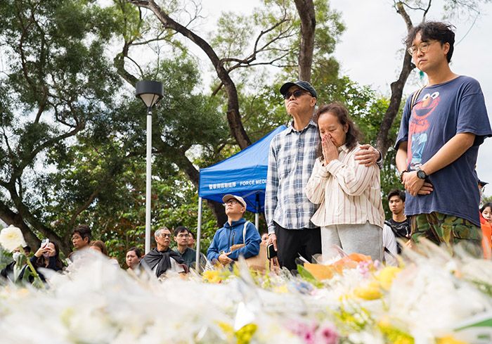 香港大埔宏福苑附近的公园,黄、白菊花海正一圈又一圈扩大。长长的哀悼队伍从公园延伸至一公里外,市民们手持菊花、眼含泪光。有人折叠千纸鹤祈愿,也有人只是静静抬头望着不远处在大火侵蚀下焦黑的大楼。