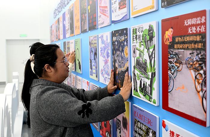 “快闪”结束后,两岸青年将63幅作品张贴于旅客通道的临时展墙。在榕台胞、高校教师林芳槿为学生的作品拍照留念。经林芳槿指导的多幅海报成功入选展览。她受访时说,“这次创作不仅是一次艺术表达,更是一场关于社会包容性的深度对话。我告诉学生要‘用心看见需求’。让两岸青年共同思考如何让城市更有温度,意义非凡。”