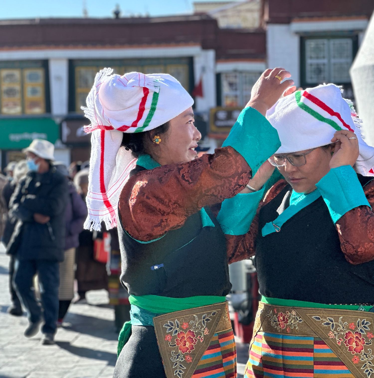 12月4日,拉萨大昭寺前信众整理着装拍照留念。(图/中新社)