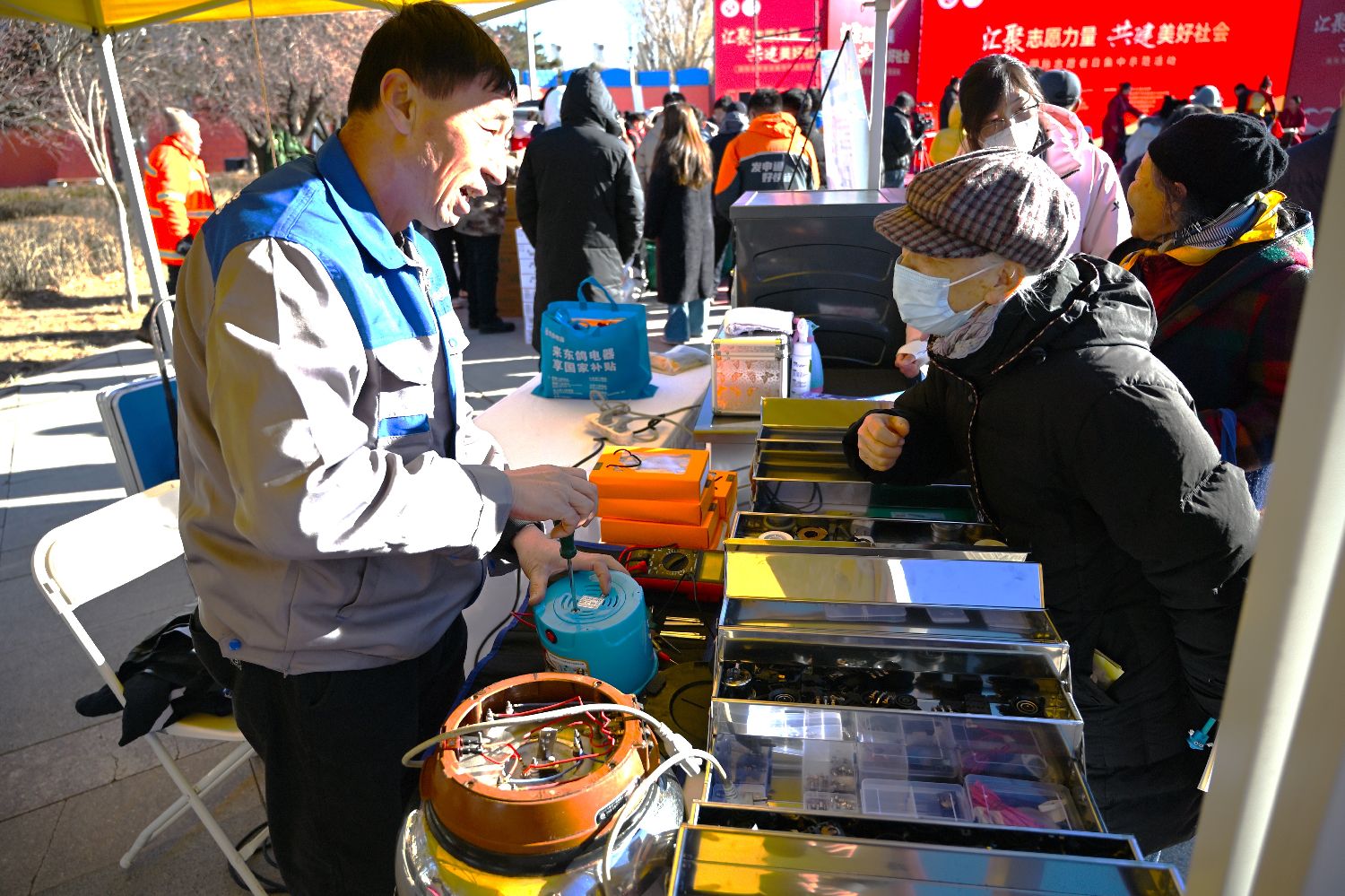 今年12月5日是第40个国际志愿者日。 从1986年起,每年的12月5日各国政府、联合国系统和民间社会组织为全球志愿人员庆祝。图为中国内蒙古,2025“汇聚志愿力量 共建美好社会”国际志愿者日集中示范活动在呼和浩特市举行,志愿者为民众免费修理家电。(中新社)