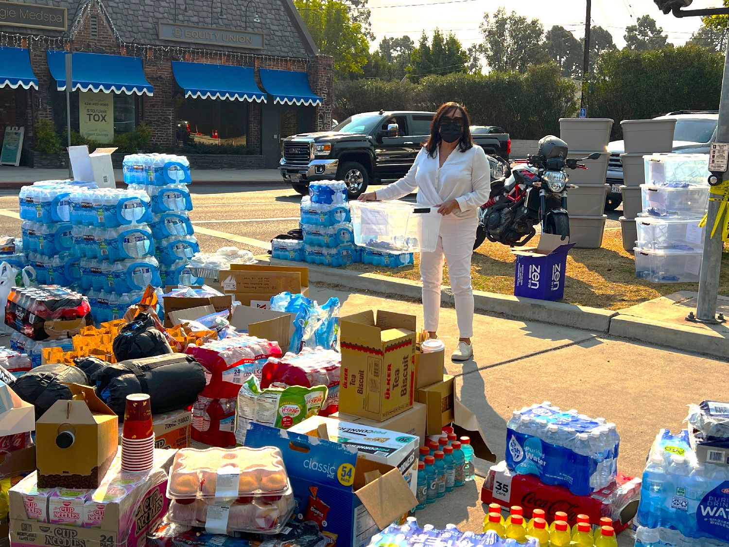 资料图为在美国加利福尼亚州洛杉矶地区爆发“帕利塞兹大火”(PalisadesFire)和“伊顿大火”(EatonFire)期间,志愿者戴着口罩在火灾现场附近为灾区民众提供免费的食物和饮用水等。(中新社)