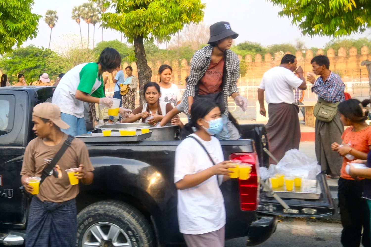 资料图为缅甸曼德勒,志愿者在地震重灾区向受灾民众派发饮品。(中新社)