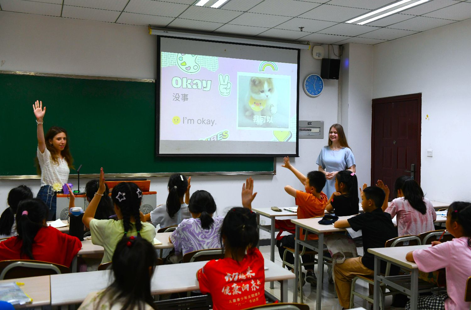 图为中国重庆,两名俄罗斯籍的志愿者老师为小朋友们教英语。(中新社)