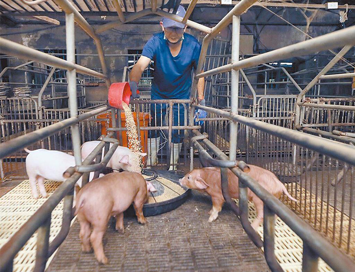 图为台湾北部一处养猪场內,猪农正以饲料喂猪。(图/ 台北中时新闻网资料图)