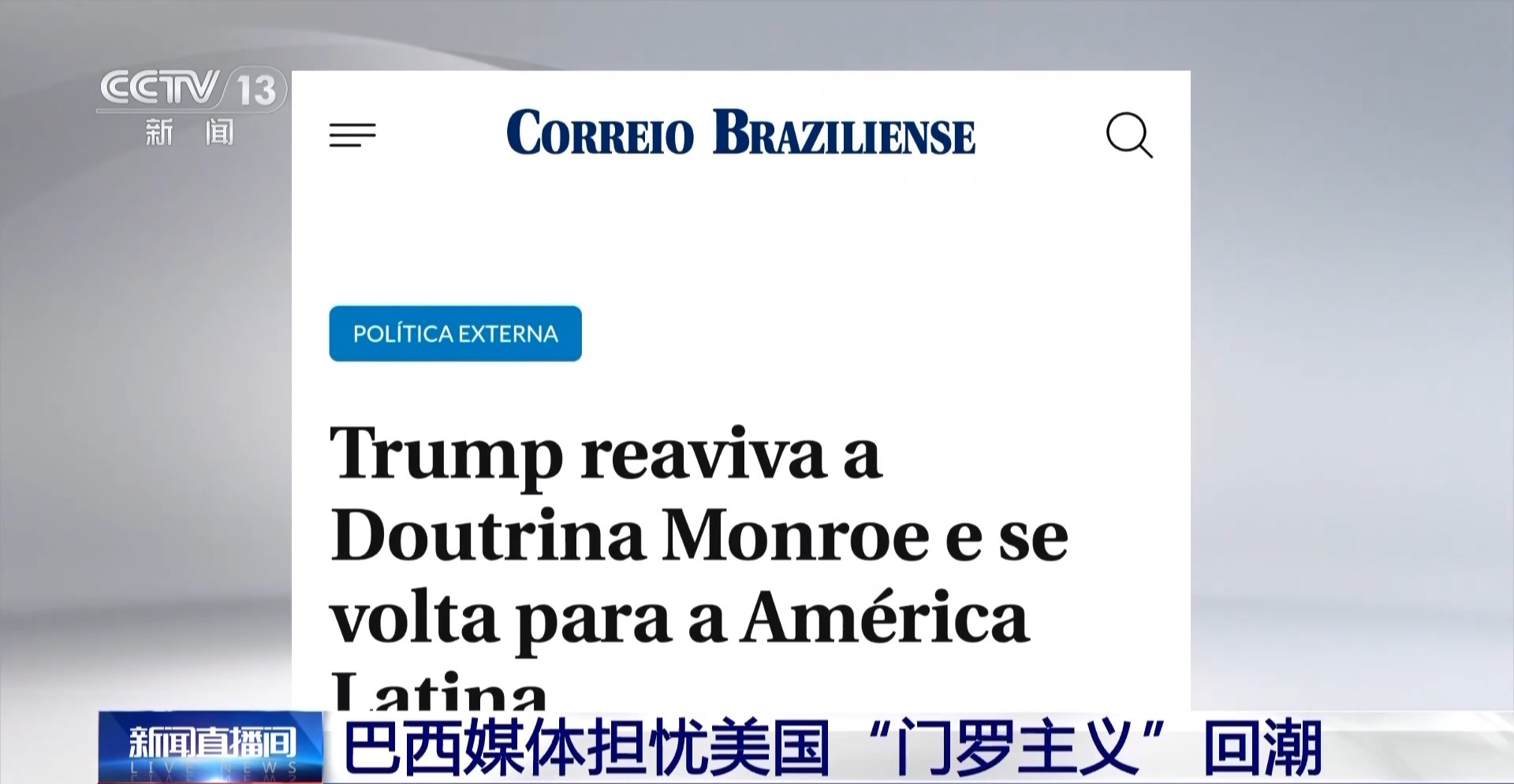 《巴西邮报》引述巴西国际关系学者霍尔兹哈克等人士观点,认为“特朗普推论”意味着“门罗主义”式地缘排他思想的卷土重来。