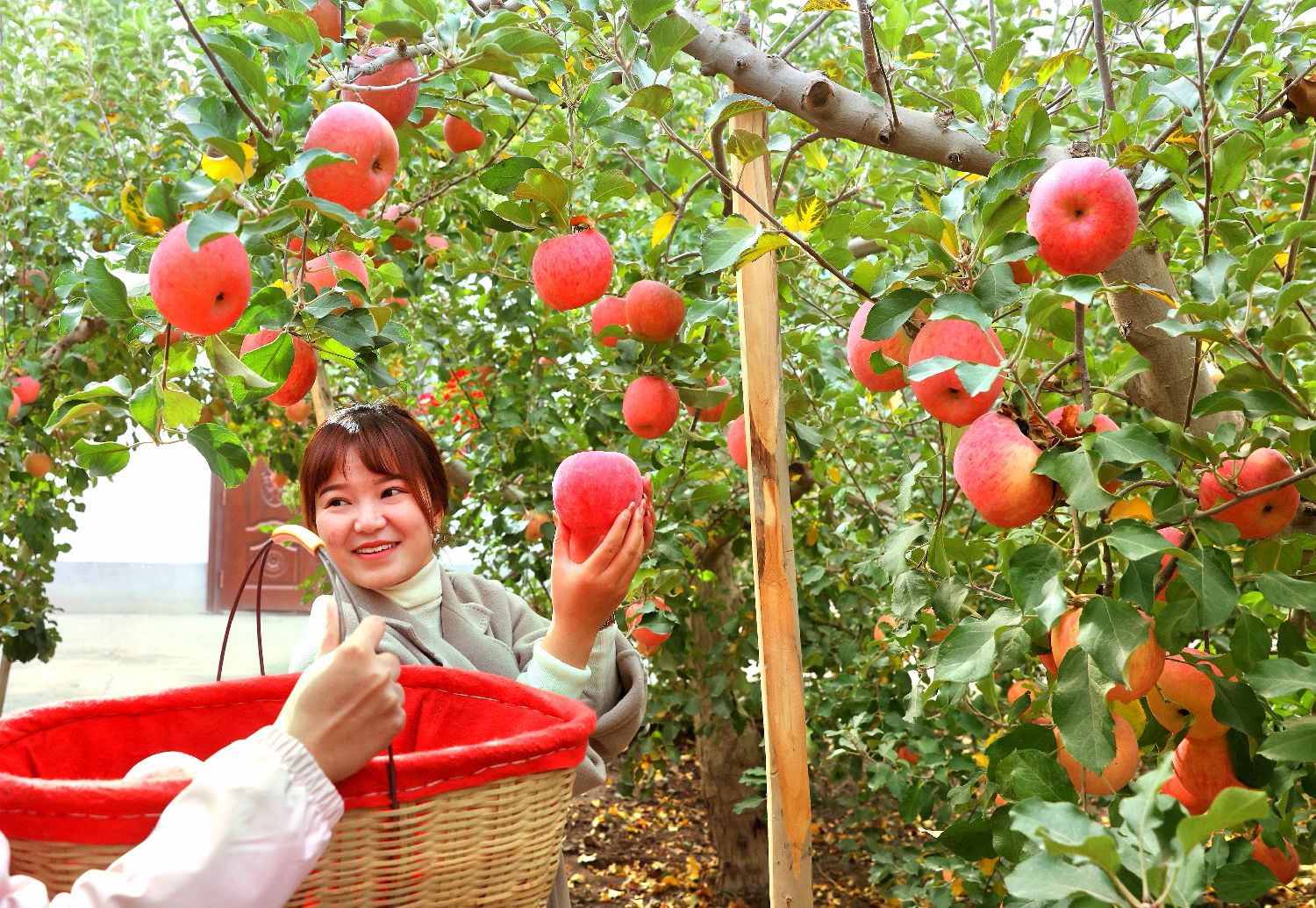 10月23日,新疆阿克苏地区首届苹果文化旅游节暨采摘季活动在阿克苏温宿县开幕。阿克苏是新疆的优质特色果品主产区,拥有14个地理标志证明商标。目前,全地区苹果种植总面积50.48万亩,总产量81.72万吨,已形成苹果种植、生产、加工、销售、观光旅游等为一体的“三产”融合发展新模式。图为游人体验采摘乐趣。(图/中新社)