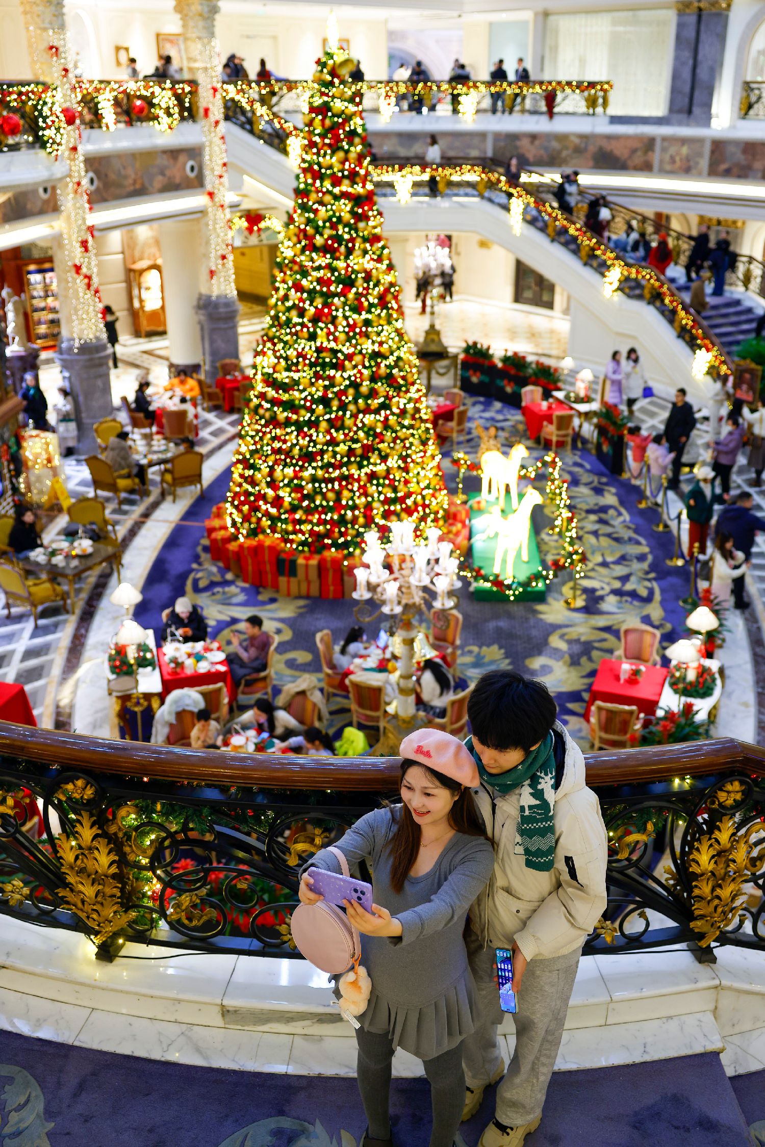 2025年12月7日,在北京励骏酒店,游人以圣诞树为背景合影。(王亚霓 摄)