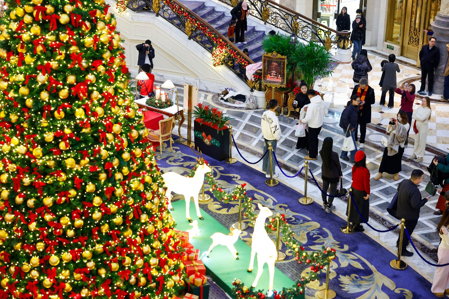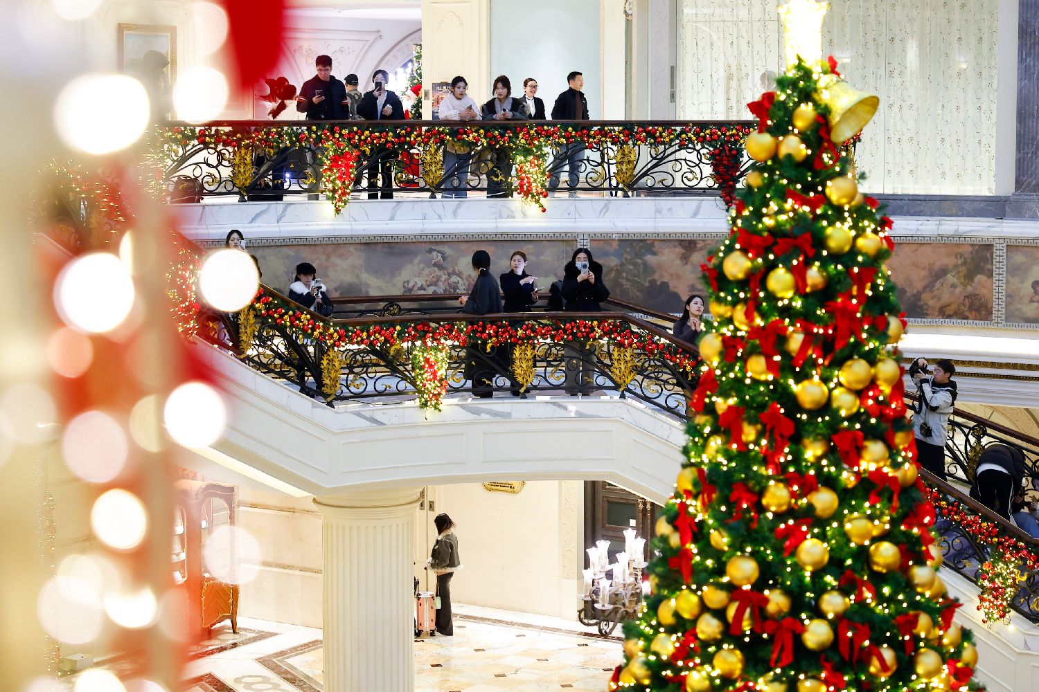 2025年12月7日,在北京中国大饭店,圣诞装置旁正在进行中国传统民乐的现场演出。(王亚霓 摄)