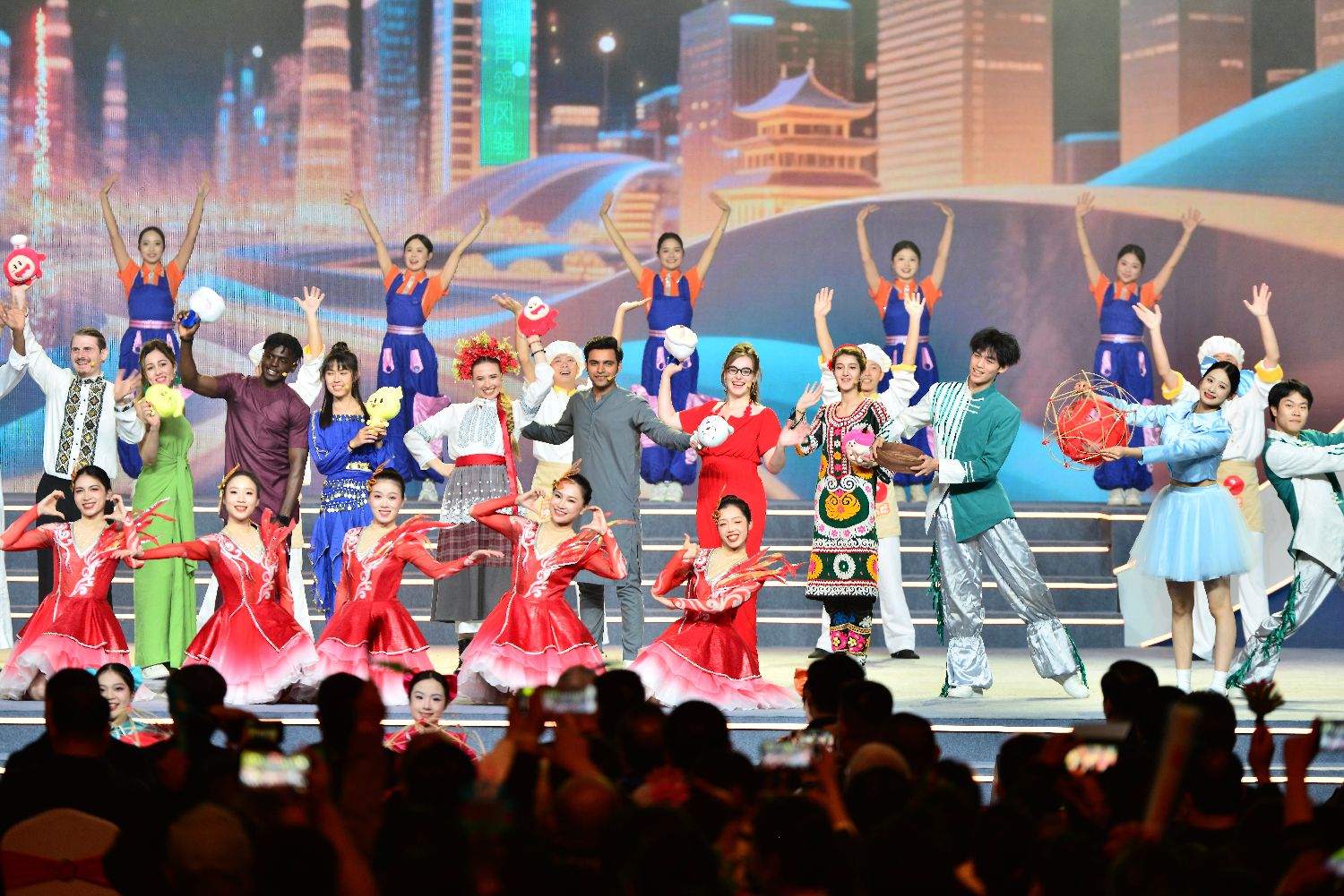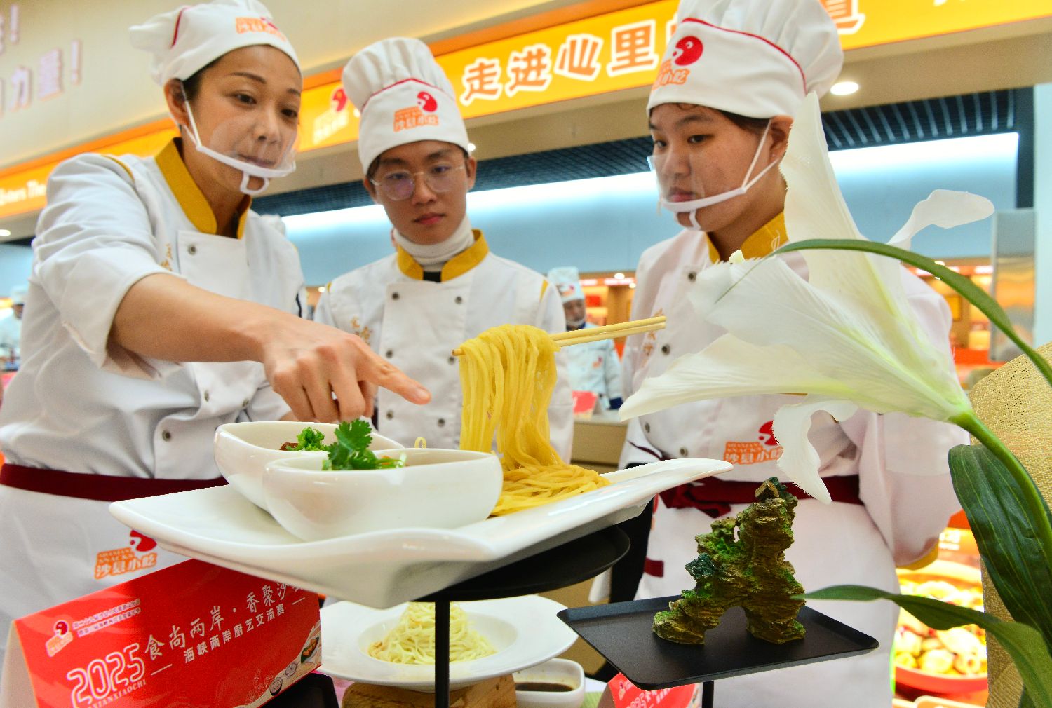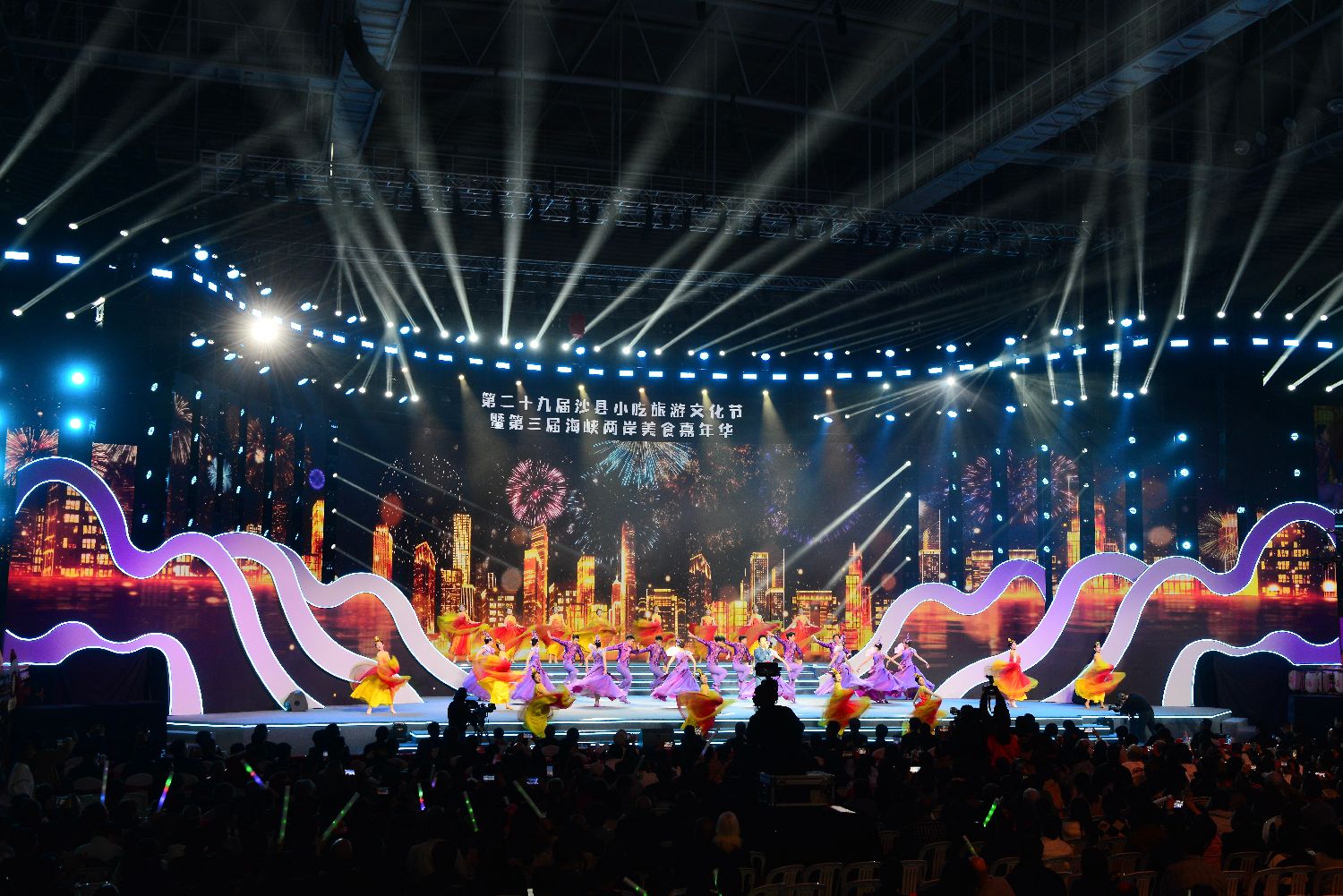 12月7日,“中国小吃之乡”福建沙县在一片烟火气中迎来小吃旅游文化节。国际小吃创意大赛、小吃技艺千人体验等活动同步举行,吸引众多台胞参与制作、交流。这场以美食为纽带的交流,最终汇聚成“两岸同做一道菜”的生动场景。截至目前,沙县小吃全球门店规模已近10万家,年营业额突破550亿元人民币,带动就业超30万人。图为12月7日,第二十九届沙县小吃旅游文化节暨第三届海峡两岸美食嘉年华在福建省三明市沙县区开幕。演员在“幸福小吃一家亲”文艺晚会上表演节目。(中新社)