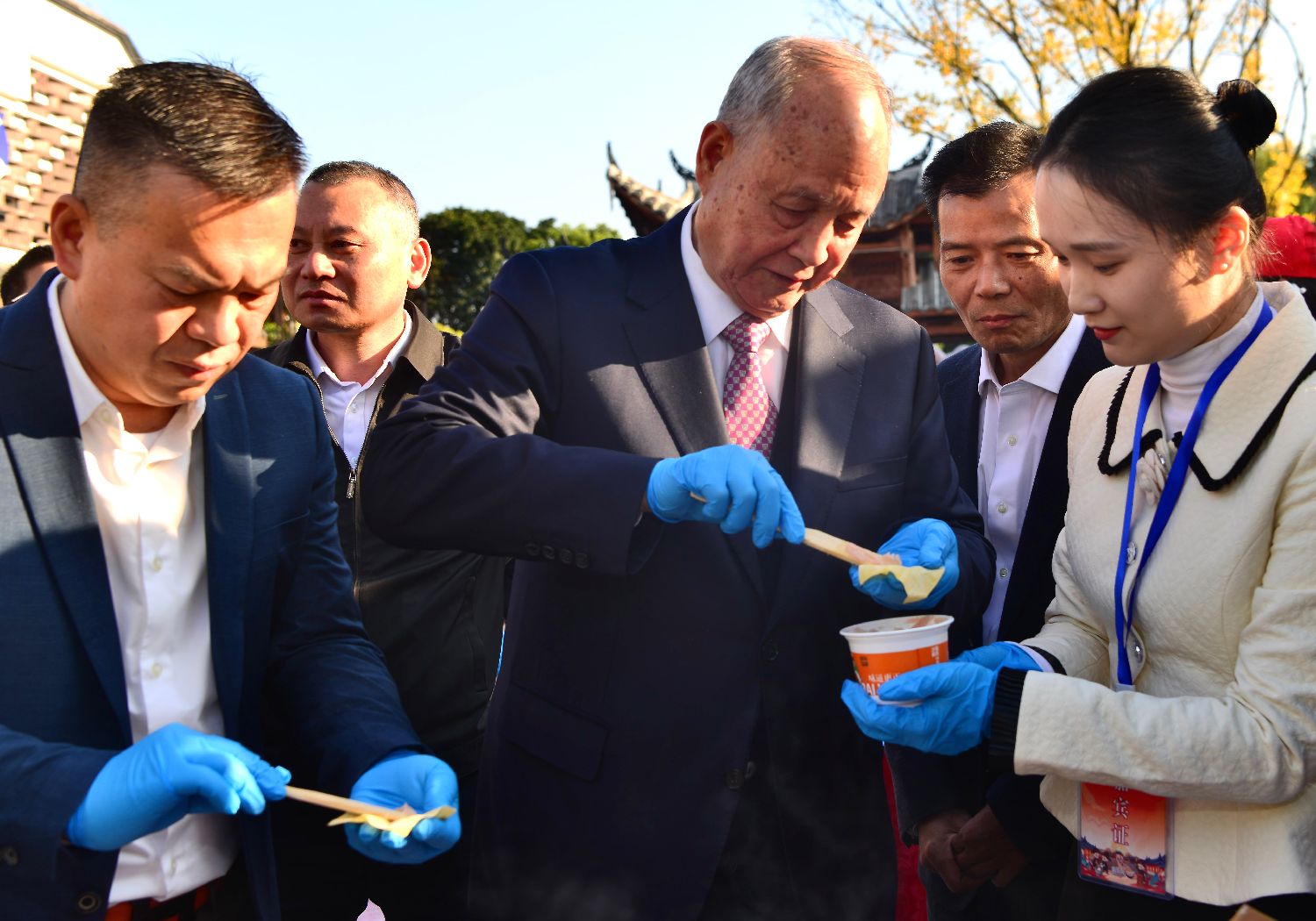 12月7日,台湾中华民族发展基金会董事长、海基会原董事长林中森在“非遗小吃秀 共品沙县味”沙县小吃技艺千人体验活动上体验包扁肉。(中新社)