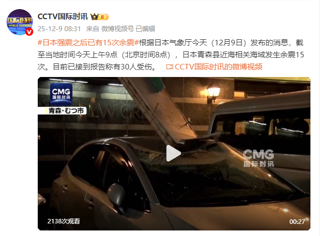 根据日本气象厅今天(12月9日)发布的消息,截至当地时间今天上午9点(北京时间8点),日本青森县近海相关海域发生余震15次。目前已接到报告称有30人受伤。