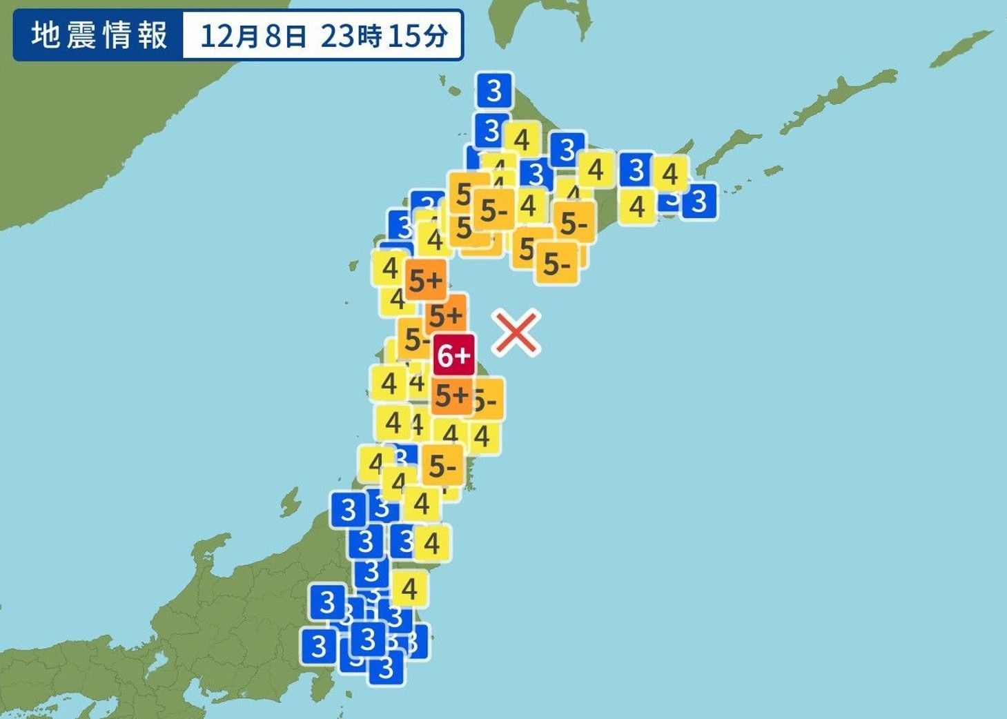 当地时间8日23时15分(北京时间8日22时15分)许,青森县东部海域发生强烈地震,初步监测震级为7.6级,9日凌晨修正为7.5级。地震发生后,日本气象厅对北海道太平洋沿岸中部、青森县太平洋沿岸、岩手县发出海啸警报,多地观测到海啸。气象厅还会同内阁府首次发布“北海道·三陆沿海续发地震注意情报”,这意味着今后一周左右震源区域附近发生大地震的概率高于平时。