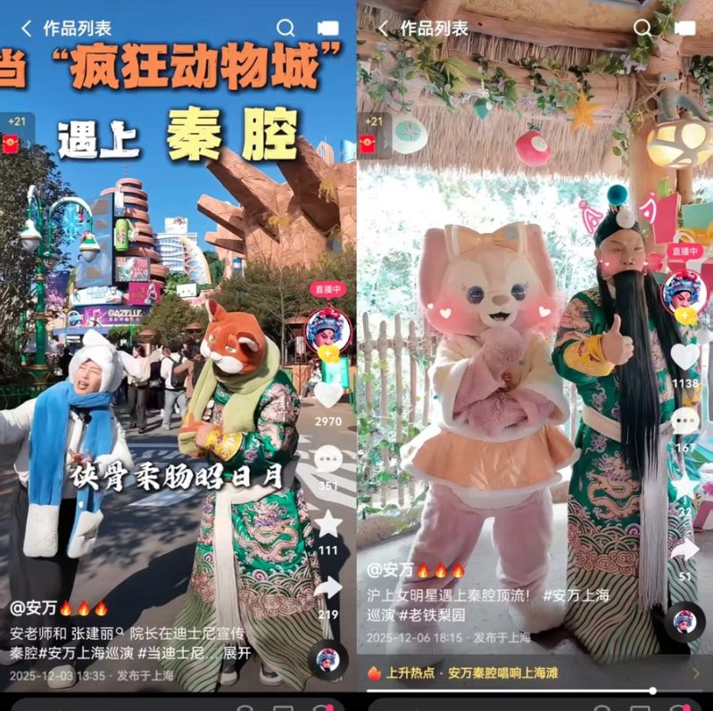 “狐兔同心天地鉴,情谊花好月又圆……”12月3日上海迪士尼乐园,安万即兴开唱,教玲娜贝儿摆出秦腔经典亮相动作,这是他48小时快闪挑战的第一站。当地时间当天下午在欢乐谷花车巡游中,秦腔演员们化身财神、关羽、孙悟空,表演甩袖、亮相。晚上8点外滩游轮,安万带领剧团成员与管弦乐队同台,一边是二胡、梆子的铿锵节奏,一边是长笛、小提琴的悠扬旋律。当游轮行至东方明珠,安万即兴改编唱词,用秦腔赞美上海繁华,随后带领众人唱响《潼关》。12月4日,剧团走进复旦大学,水袖功、把子功、花枪尽显秦腔的刚劲力量。唢呐、二胡演绎《云宫迅音》及多首现代歌曲,赢得掌声不断。