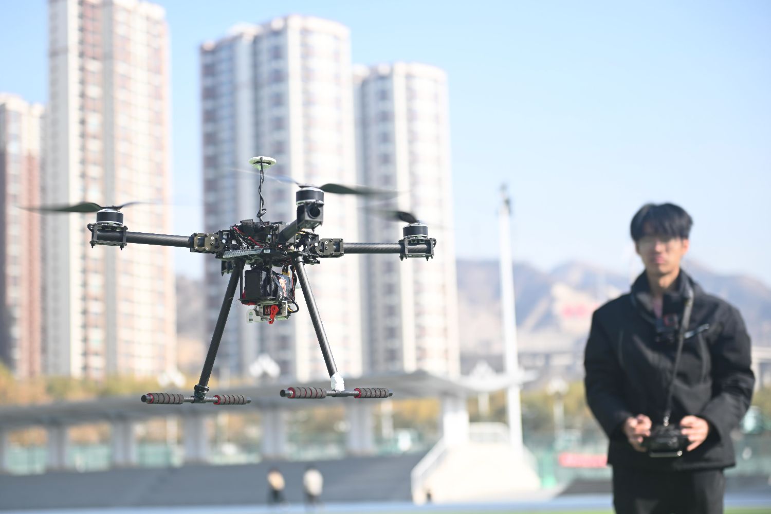 11月19日,在位于甘肃省兰州市的兰州交通大学内,该校测绘与地理信息学院无人机协会成员对自己制作的无人机、航模进行试飞调试工作。在全国大学生GIS应用技能大赛、全国大学生测绘学科创新创业智能大赛等比赛中,该校代表队获得不少佳绩。(图/中新社)