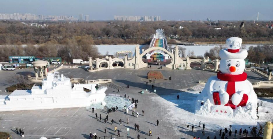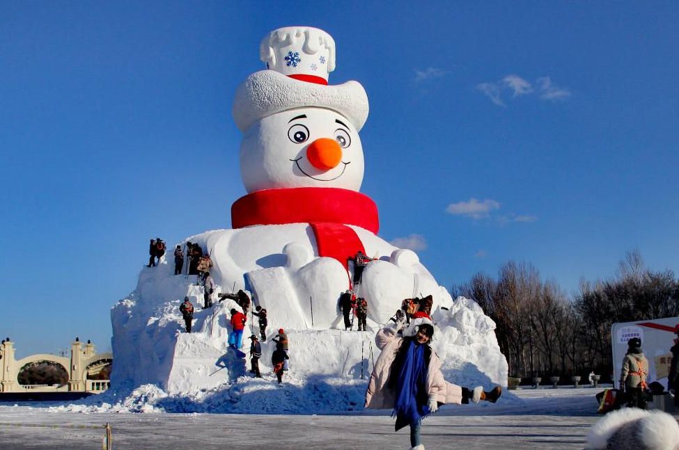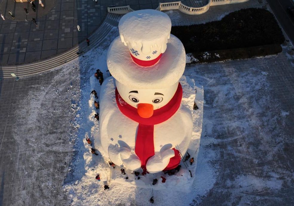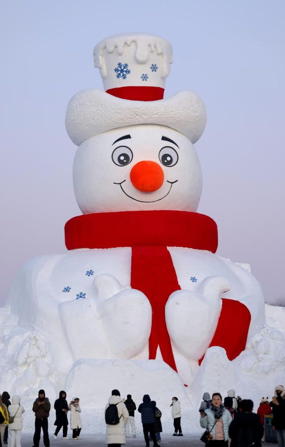 12月8日,黑龙江省哈尔滨市,23.8米高的巨型雪雕“雪人先生”制作已近尾声,吸引众多游客打卡拍照。(中国央视网)