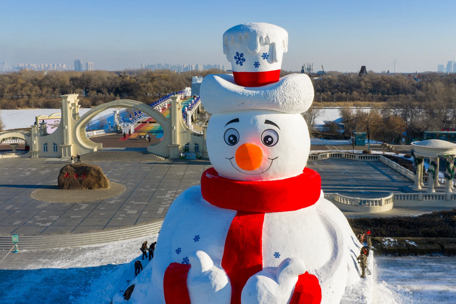 12月9日,黑龙江哈尔滨,第38届太阳岛雪博会标志性景观“雪人先生”主体完工。据悉,今年的“雪人先生”在延续往年经典形象的基础上,高度提升至23.8米,用雪量达5000立方米。(无人机照片)(中新社)