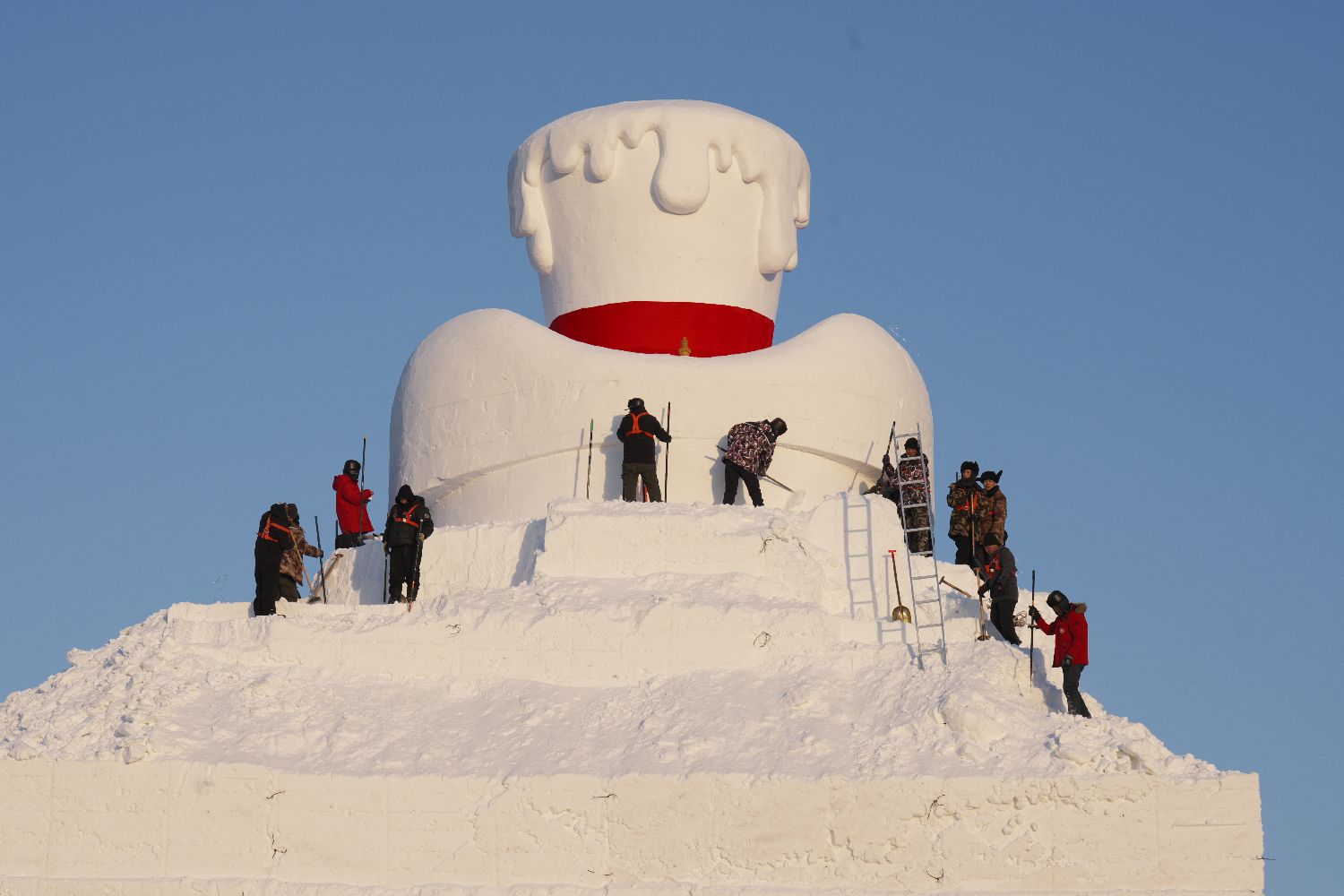 12月5日,黑龙江哈尔滨,第38届太阳岛雪博会标志性景观“雪人先生”启动雕刻施工。40余名雪雕匠人在20余米高的雪坯上紧张作业。据悉,今年的“雪人先生”在延续往年经典形象的基础上,高度提升至23.8米,用雪量达5000立方米。(中新社)