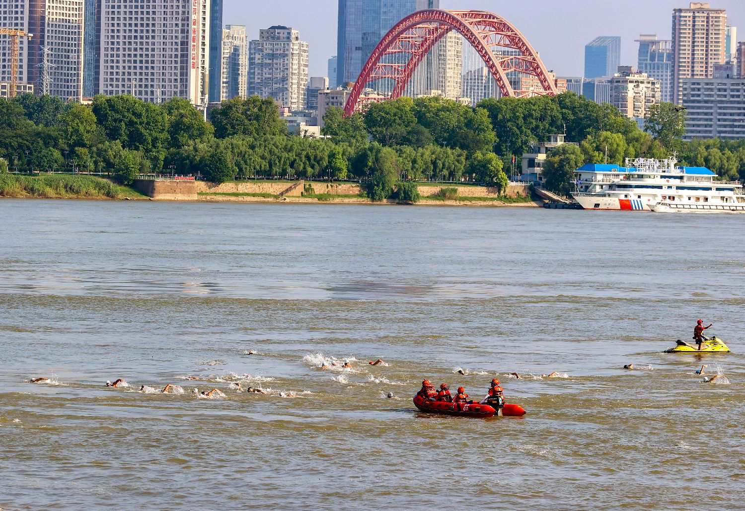 7月16日,2025第50届武汉7·16渡江节盛大启幕。来自海内外的2000余名“泳士”击水长江,开启一场“万里长江横渡,极目楚天舒”的竞渡盛会。图为参加抢渡挑战赛男子选手劈波斩浪。(图/中新社)