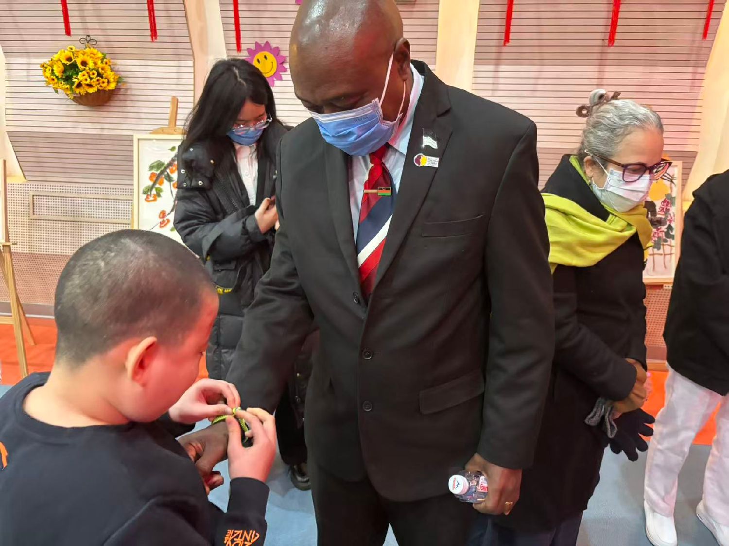 12月9日,正在中国参加第二期经济、社会及文化权利人才研修班的40多名各国政府代表、驻联合国外交官和人权高专办官员走进北京市儿童福利院。图为北京市儿童福利院儿童为外宾送上亲手制作的手环。(图/中新社)