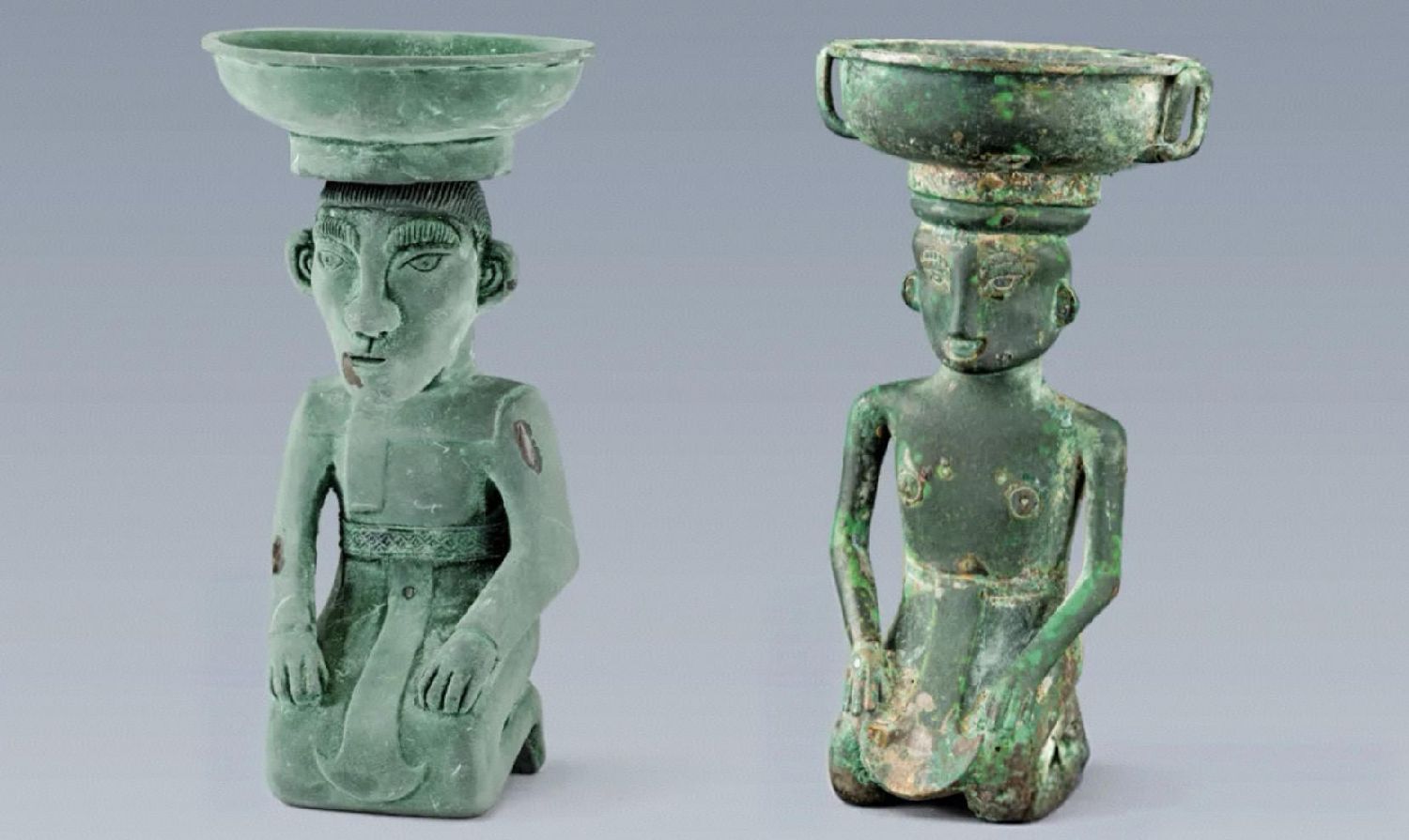 山西翼城大河口西周墓地出土的两件铜人顶盘。(图/中新社)