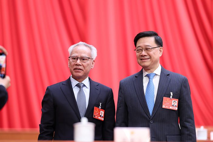 3月5日,十四届全国人大三次会议开幕会在北京人民大会堂举行。图为列席人大会议开幕会的香港特别行政区行政长官李家超(右)、澳门特别行政区行政长官岑浩辉。(图/ 中新社)