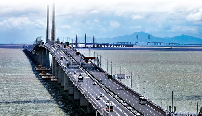 香港特区政府运输署“粤车南下”预约系统于当地时间15日上午8时30分起接受预约。图为车辆经港珠澳大桥出行。(图/香港《文汇报》)