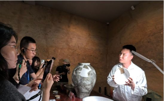 刘潇(右一)介绍文物修复流程。(图/乌鲁木齐《新疆日报》)