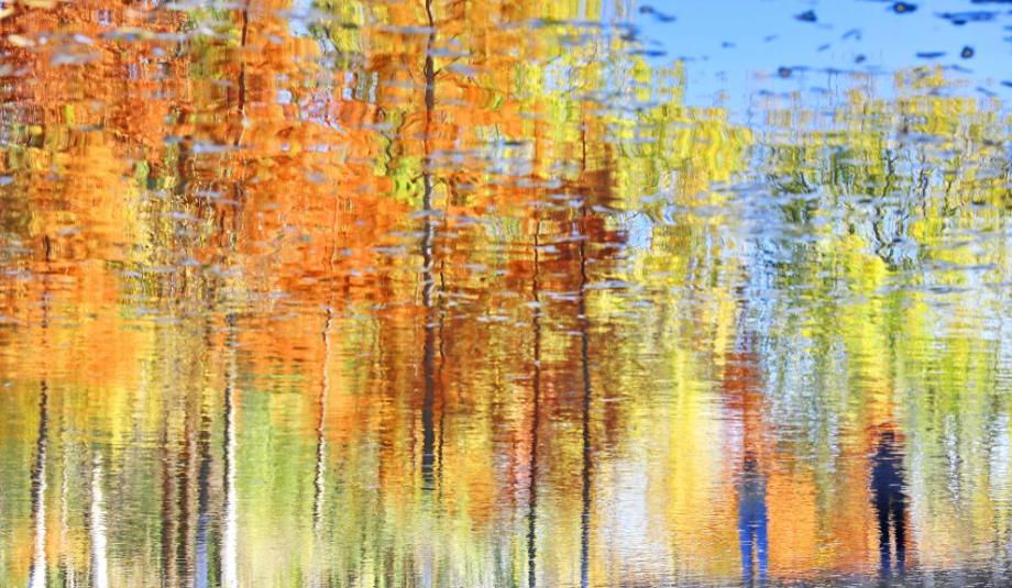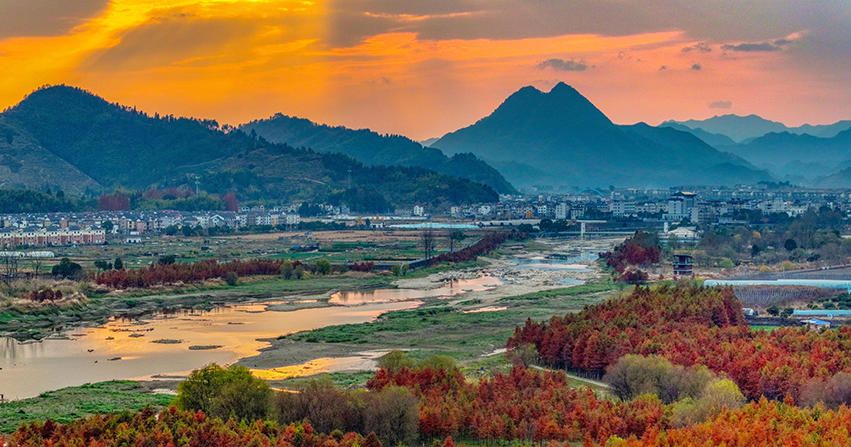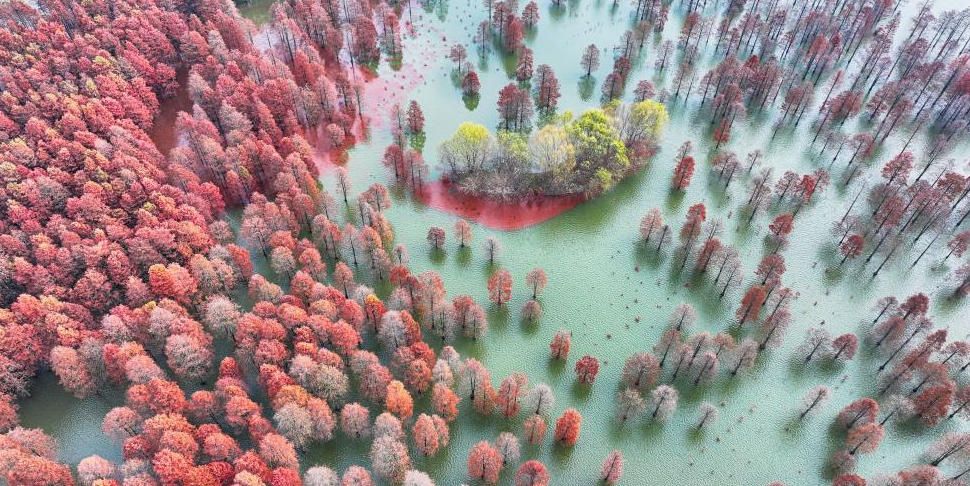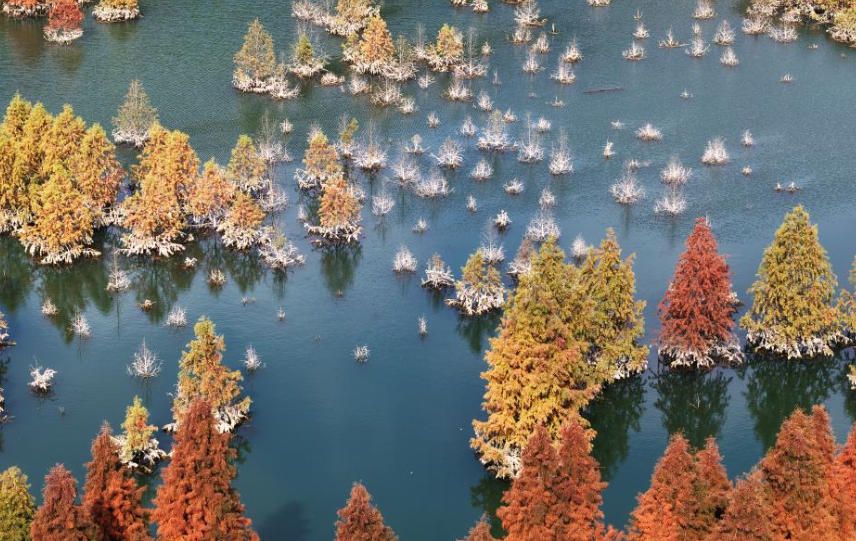 12月10日,浙江省杭州市淳安县汾口镇红星村,武强溪生态湿地的水上森林色彩斑斓,风景如画。(人民网)