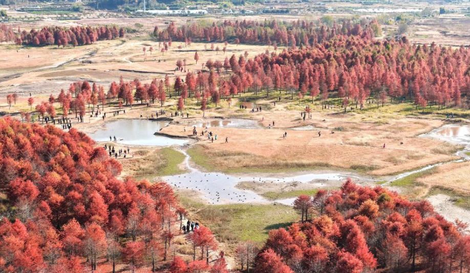 12月14日拍摄的昆明市盘龙区滇源街道甸尾村水杉湿地(无人机照片)。(新华网)
