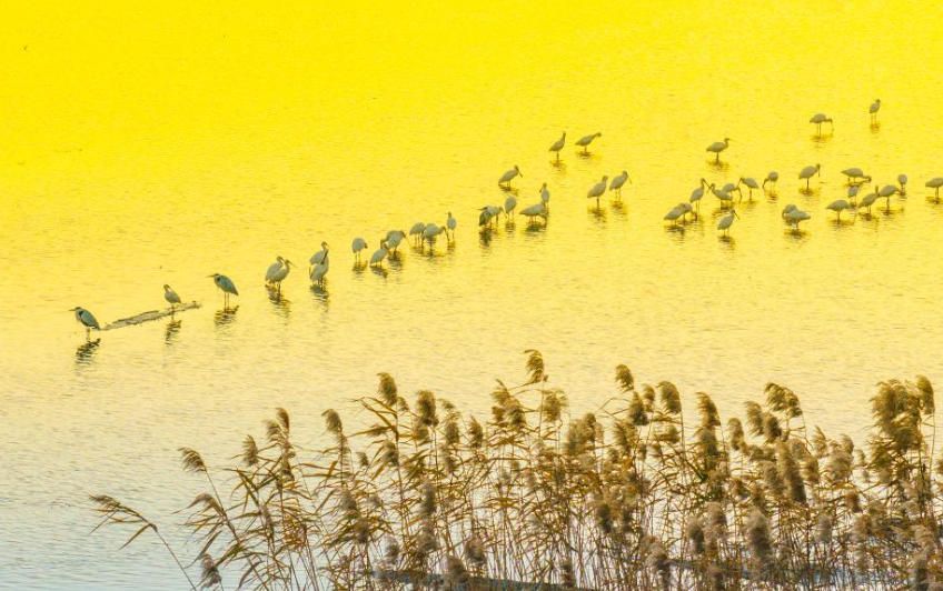 12月15日,群鸟在江苏兴化里下河国家湿地公园栖息(无人机照片)。(新华网)