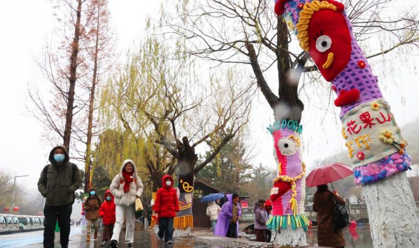 12月13日,在江苏省连云港市花果山景区,游客从“穿毛衣”的树旁走过。(新华网)