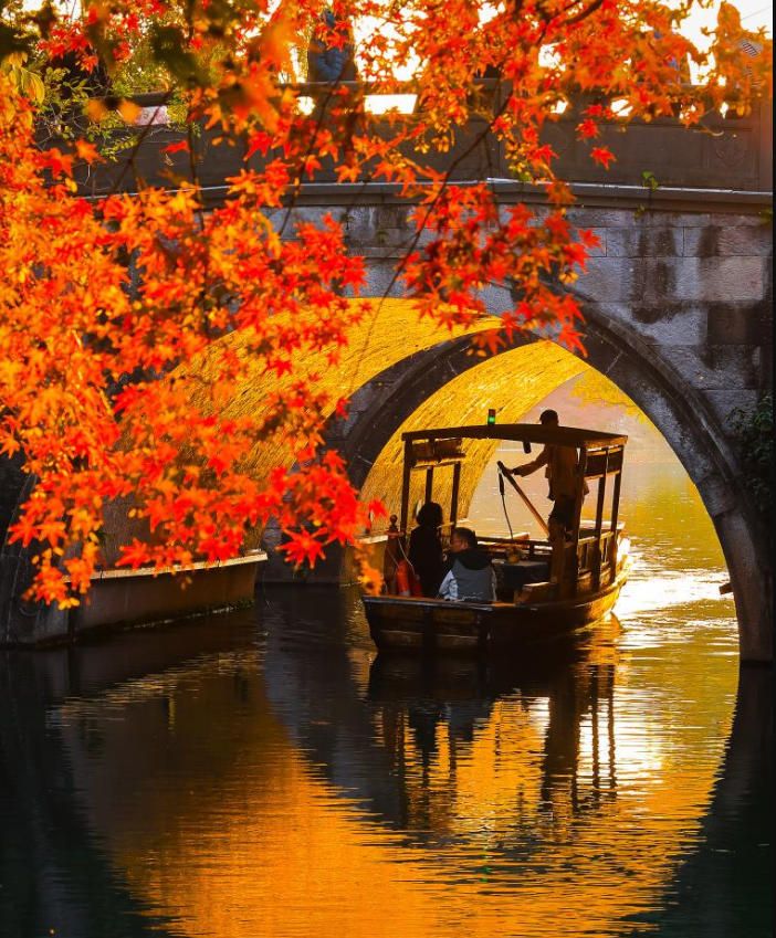11月23日,游客在浙江省宁波市奉化区溪口镇文昌阁旁的拱桥上赏景游玩(无人机照片)。(新华网)