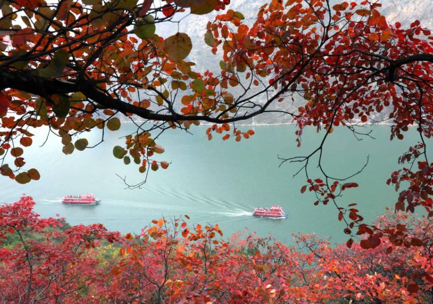 12月7日,船只行驶在红叶映衬下的长江三峡巫峡段。(新华网)
