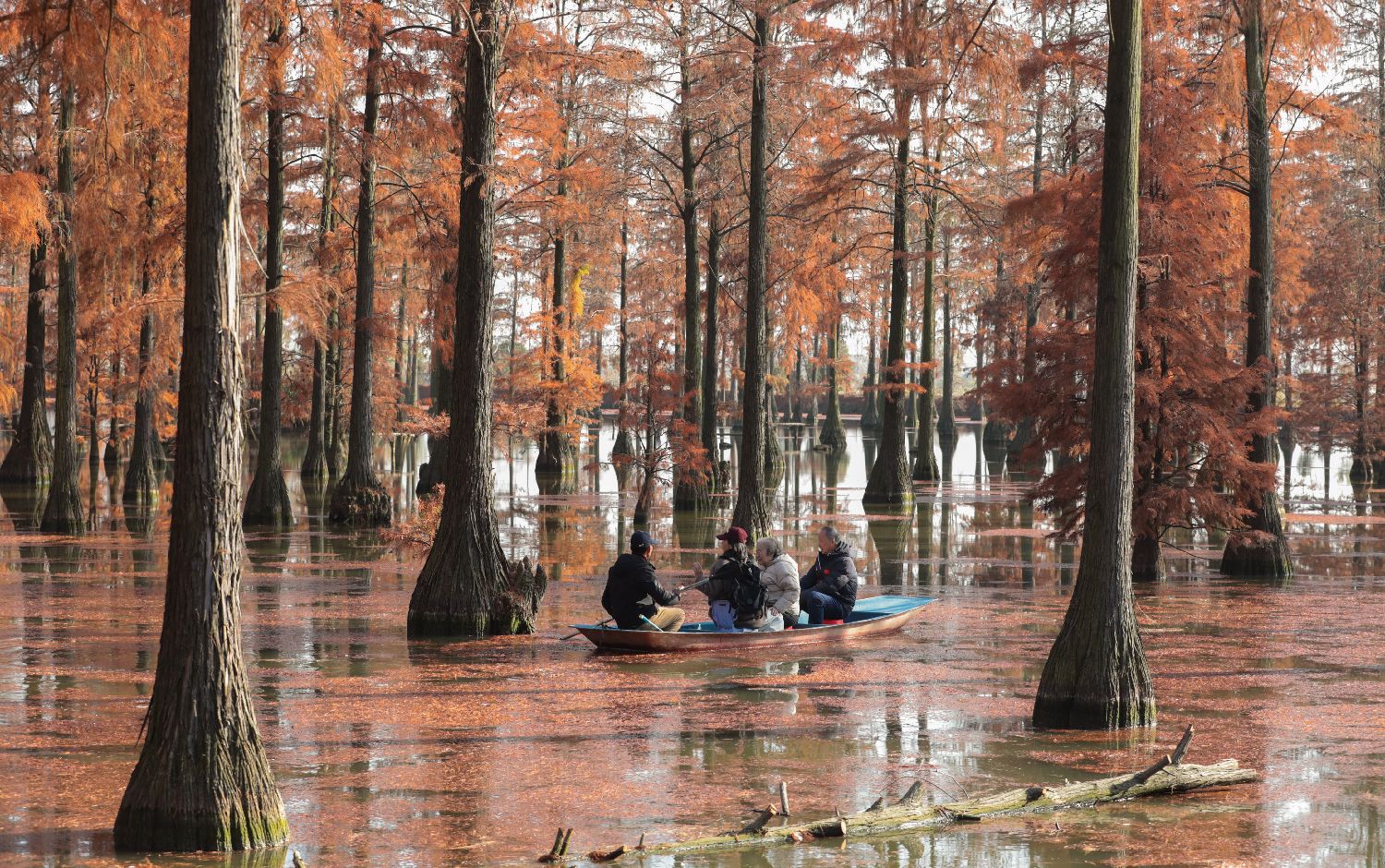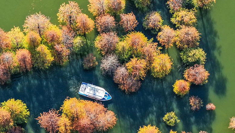 12月14日,湖北武汉,位于新洲区的涨渡湖湿地“水上森林”色彩斑斓。万余棵池杉树叶金黄,林水相依,构成一幅绚丽的生态画卷。图为游客乘船在涨渡湖湿地“水上森林”中游玩。(中新社)