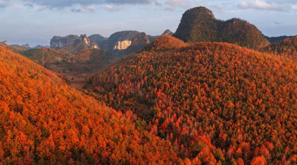 12月12日,贵州省黔南布依族苗族自治州惠水县抵季乡翁坪村,枫叶绚烂夺目,红若火焰的枫林覆盖山坡,与高低起伏的峰林相映,宛如彩色油画。(中国央视网)