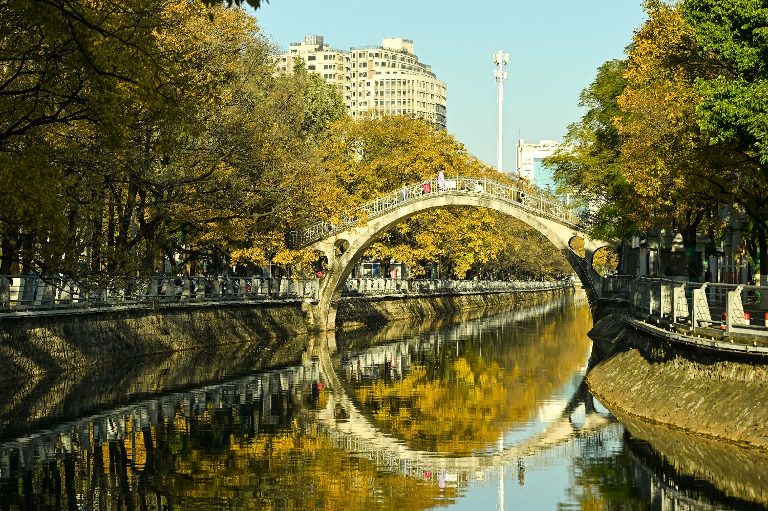12月15日,大观河畔金黄的滇朴。近日,云南省昆明市大观河畔的滇朴满树金黄,市民在鎏金树影与和煦阳光中享受冬日“春城”别样风景。(中新社)