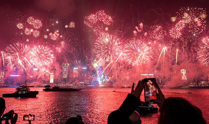 香港旅游发展局宣布,12月31日跨年倒数活动将会取消烟花汇演。图为去年跨年烟花音乐汇演在香港维港上演。 (图/中新社)